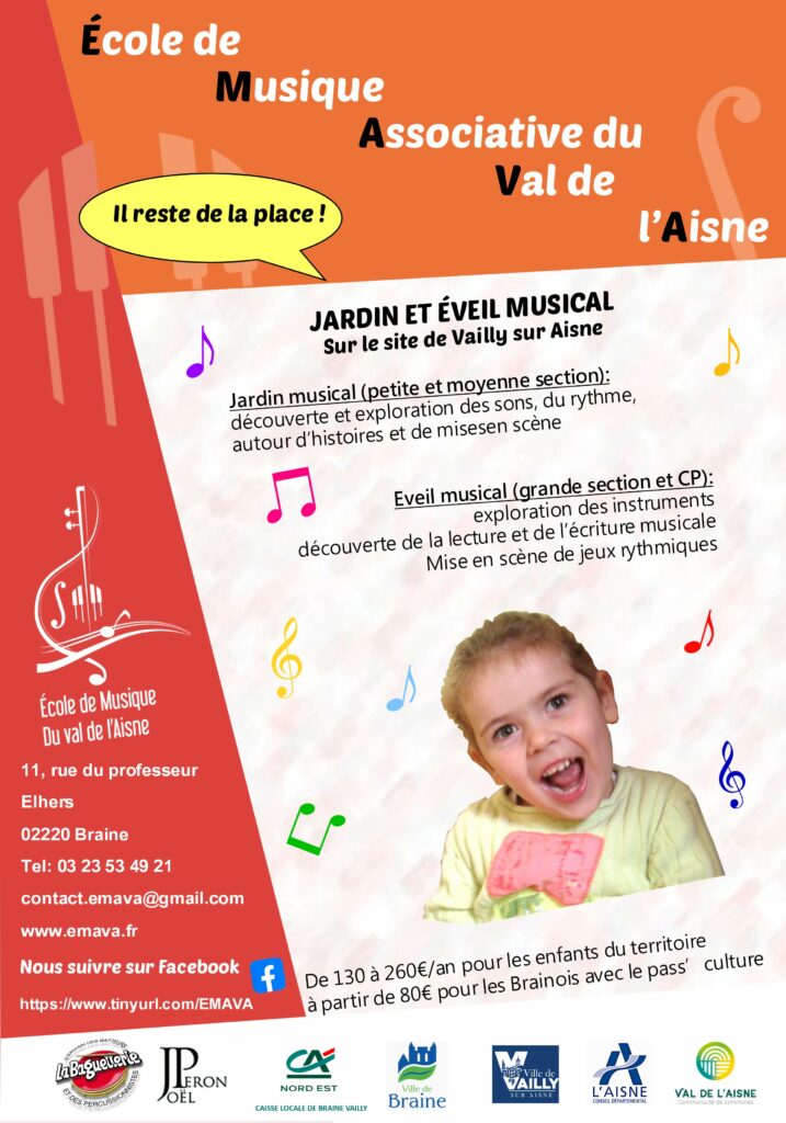 – il reste de nombreuses places en jardin/éveil musical (dès 3 ans), à la chorale enfant (du CE1 au CM2), à l’atelier musiques actuelles (adultes et adolescents dès le collège) : de 130 à 260 €/an en déduisant le chèque musique de la CCVA pour les enfants du territoire, à partir de 80€/an pour les brainois avec le Pass’Culture
